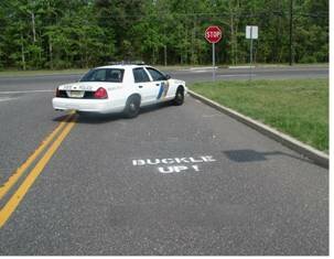 The text "BUCKLE UP" and a picture of a seat belt are painted on the exit driveways of participating organizations. There is not cost, thanks to a cooperative arrangement between the County Sheriff's Offices and the Atlantic County Department of Public Safety, to use day reporting inmates are used to do the actual painting.