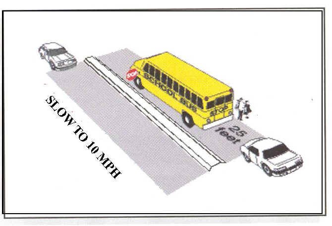 When a school bus has the red lights flashing, vehicles approaching from all directions must stop at least 25 feet from the bus. The only exception is on a divided highway, with a raised median or safety island. The vehicles approaching from the opposite direction must